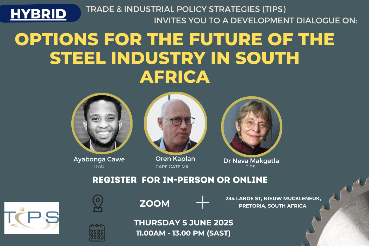 Crude steel production in South Africa faces a structural crisis as a consequence of stagnant domestic and export demand combined with rapidly rising costs at AMSA, South Africa’s only integrated steel producer. The discussion will explore options for revitalising the steel value chain over the next five to ten years, and the policies needed to implement them. TIPS Dialogues bring together academics, policymakers, civil society organisations, workers, and practitioners to discuss important issues and share ideas on industrial policy.